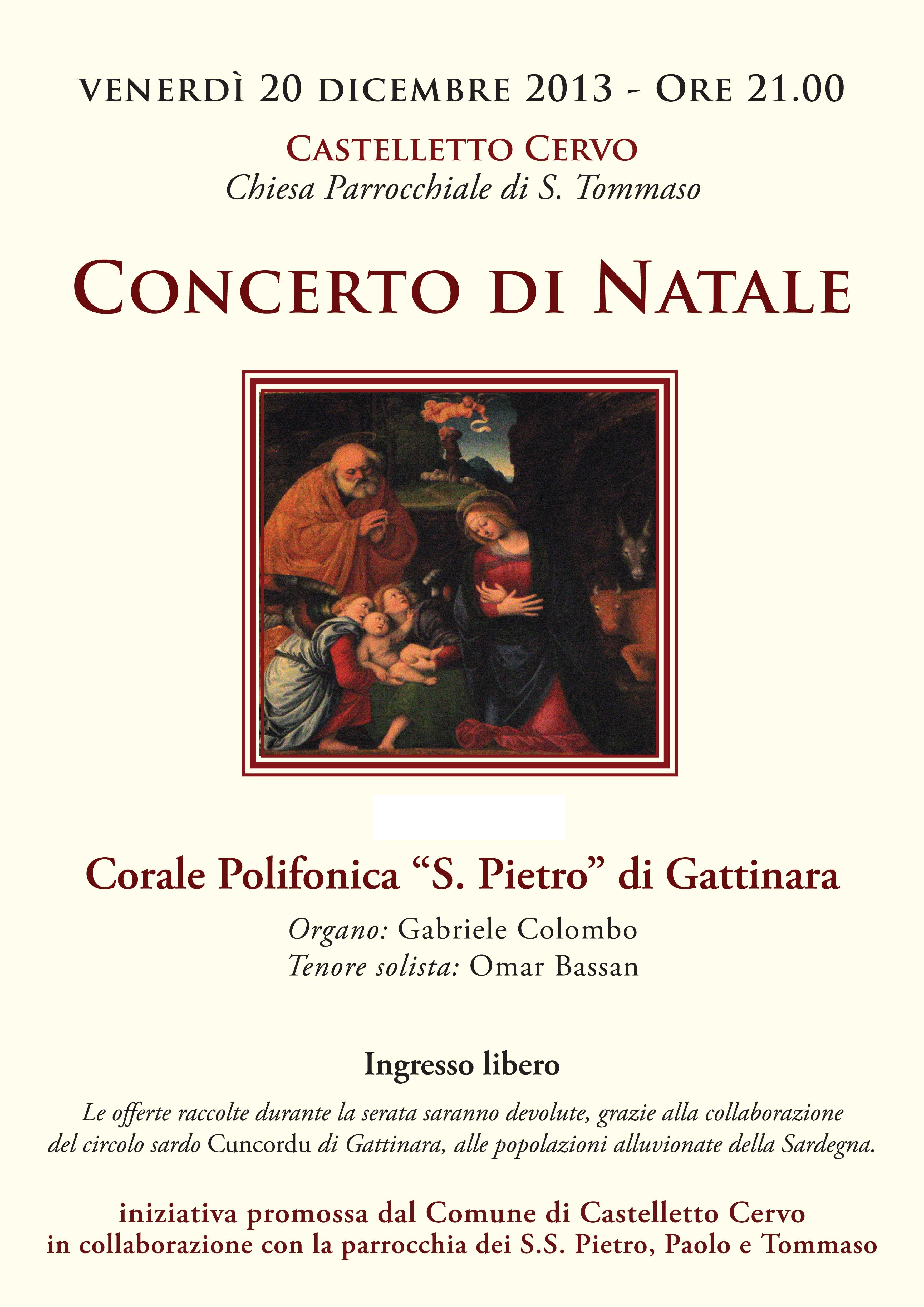 Il Comune di Castelletto Cervo in collaborazione con Parrocchia S.S. Pietro, paolo e Tommaso e Associazione Turistica Pro Loco organizza VENERDÌ 20 DICEMBRE 2013 - ORE 21 "Concerto di Natale" a favore delle popolazioni alluvionate della Sardegna