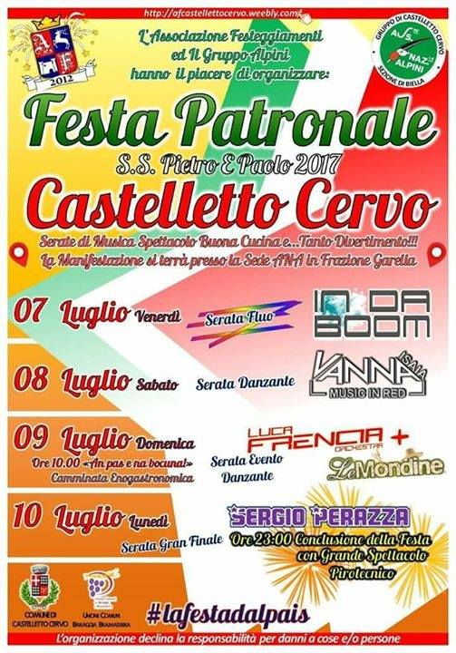 Il Comitato Festeggiamenti e il Gruppo Alpini organizzano e vi aspettano alla Festa Patronale di Castelletto Cervo da venerdì 7 a lunedì 10 luglio. Quattro serate di musica, buona cucina, spettacolo e tanto divertimento!