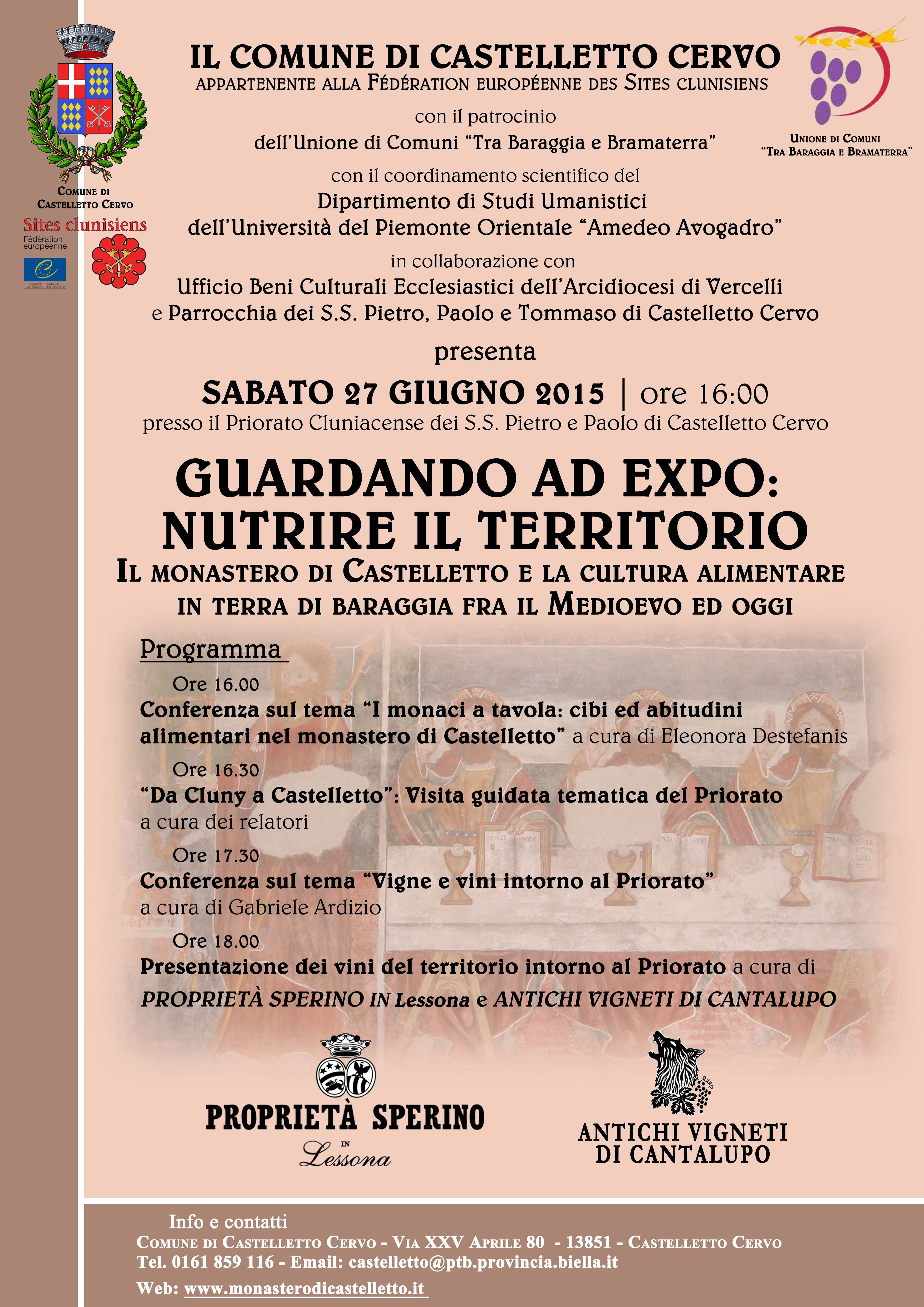 Il Comune di Castelletto Cervo, con il patrocinio dell'Unione di Comuni tra Baraggia e Bramaterra, con il coordinamento scientifico del Dipartimento di Studi umanistici dell'Università del Piemonte Orientale "Amedeo Avogadro", in collaborazione con Ufficio Bene Culturali Ecclesiastici dell'Arcidiocesi di Vercelli e Parrocchia SS. Pietro, Paolo e Tommaso di Castelletto Cervo presenta SABATO 27 GIUGNO 2015 presso il monastero l'incontro "Guardando ad Expo: nutrire il territorio. Il MOnastero di Castelletto e la cultura alimentare in terra di Baraggia tra il medioevo ed oggi".